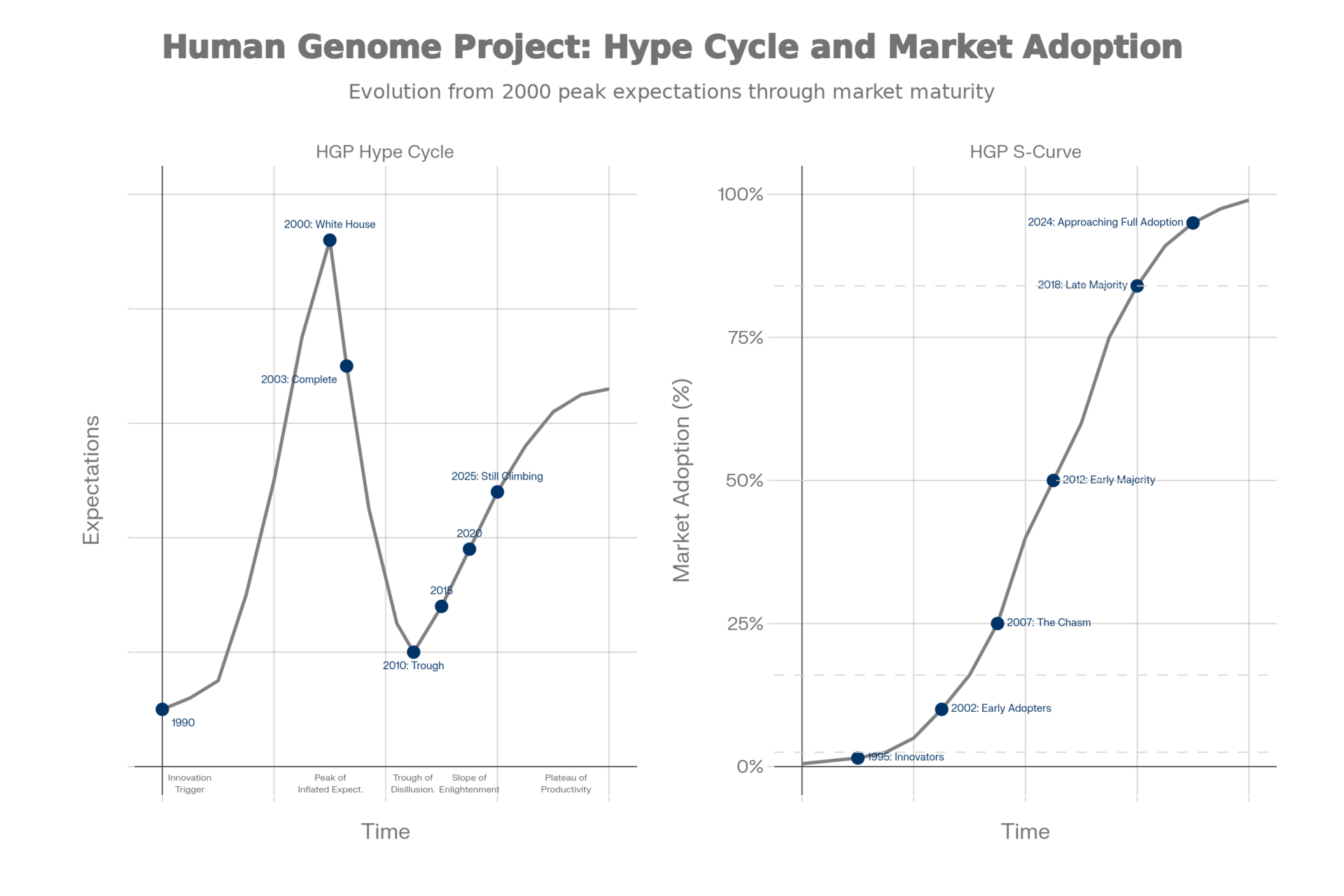 Side-by-side comparison for the Human Genome Project showing the Hype Cycle (left, tracking expectations over time) and S-Curve (right, tracking market adoption). Blue markers are placed directly on the gray reference curves to show HGP's position at specific years.