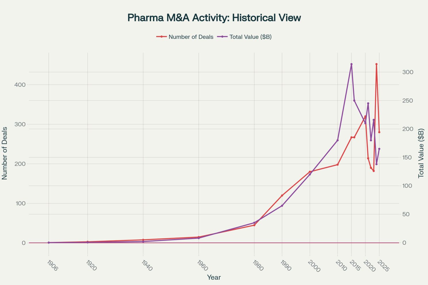 Historical pharmaceutical M&A activity from the early 1900s to today, showing dramatic increase in consolidation activity [1][18]