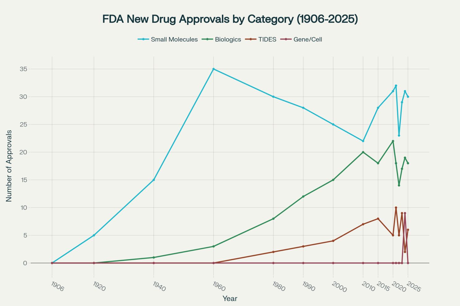 FDA new drug approvals by therapeutic category from 1906-2025, showing the evolution from small molecules to complex therapies [4][8][11]