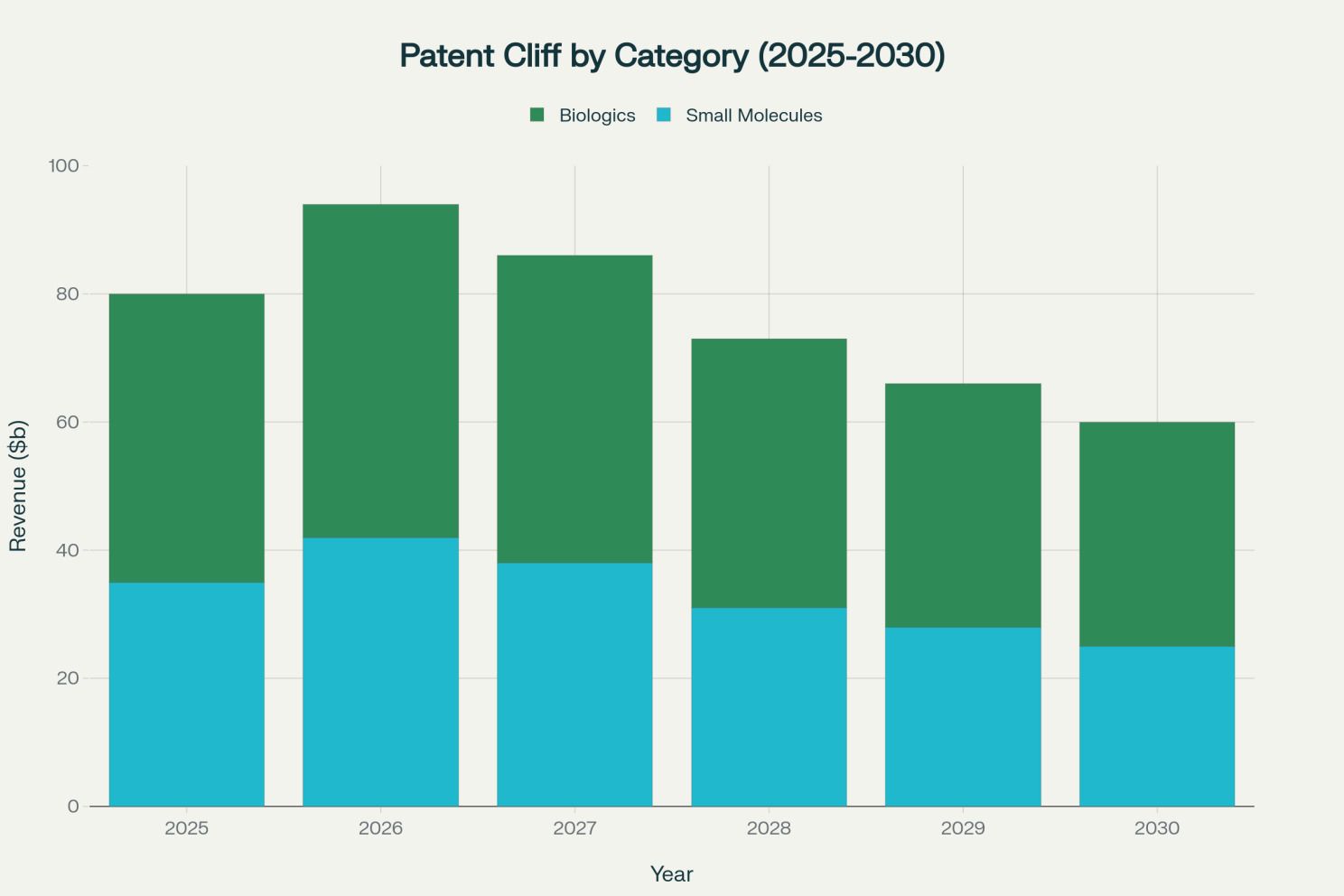 Projected pharmaceutical revenue at risk from patent expiries, highlighting the impact on both small molecules and biologics [2]
