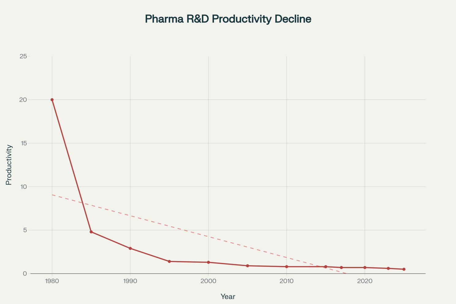 Declining pharmaceutical R&D productivity showing a 40-fold decrease from 1980 to 2025 [10][12][13]