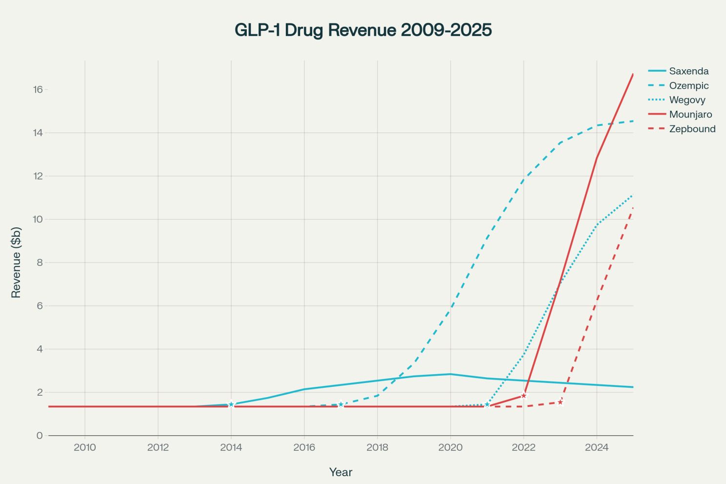 Revenue timeline for major GLP-1 weight management drugs (2009-2025) with FDA approval markers (stars)